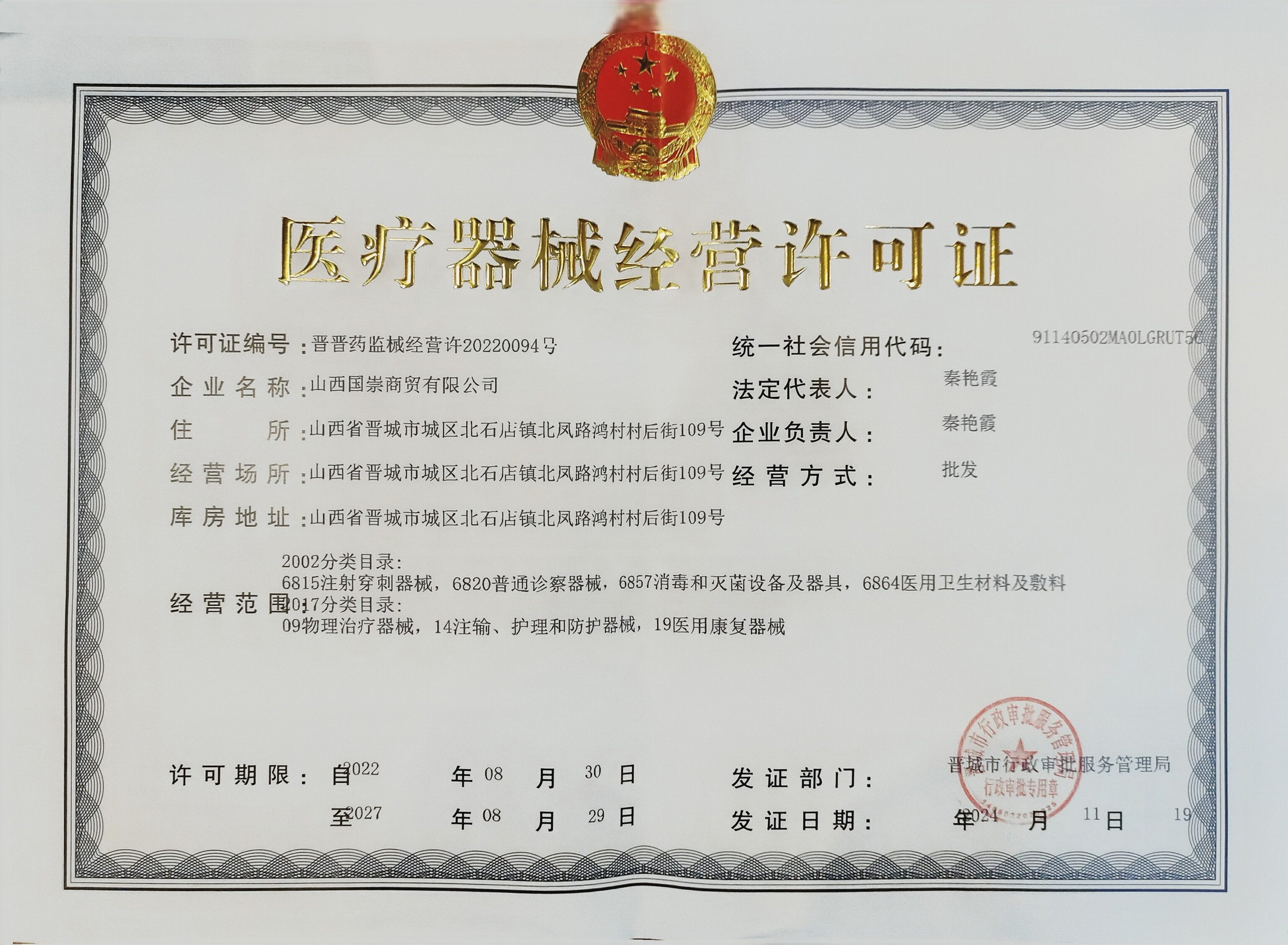 山西国崇商贸有限公司成立于 2021 年 3 月 16 日,是经合法注册的有限责任公司(自然人投资或控股),注册资本 100 万元,法定代表人秦艳霞。总部坐落于山西省晋城市城区北石店镇北风路鸿村村后街 109 号,业务覆盖医疗器械经营、食品销售及市场营销策划等多元领域,是极具发展潜力的新兴商贸企业。​